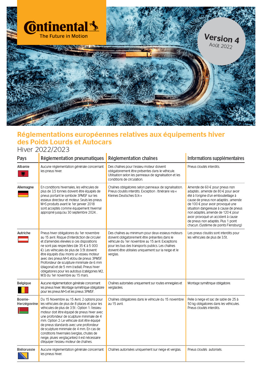 | Autriche | Pneus hiver obligatoires du 1er novembre au 15 avril. Risque d’interdiction de circuler et d’amendes élevées si ces dispositions ne sont pas respectées (de 35 € à 5 000 €). Les véhicules de plus de 3.5t doivent être équipés d'au moins un essieu moteur avec des pneus M+S et/ou de pneus 3PMSF. Profondeur de sculpture minimale de 6 mm (diagonal) et de 5 mm (radial). Pneus hiver obligatoires pour les autobus (catégories M2, M3) du 1er novembre au 15 mars. | Des chaînes au minimum pour deux essieus moteurs doivent obligatoirement être présentes dans le véhicule du 1er novembre au 15 avril. Exceptions pour les bus des transports publics. Les chaînes doivent être utilisées uniquement sur la neige et le verglas. | Les pneus cloutés sont interdits pour les véhicules de plus de 3.5t. | |
